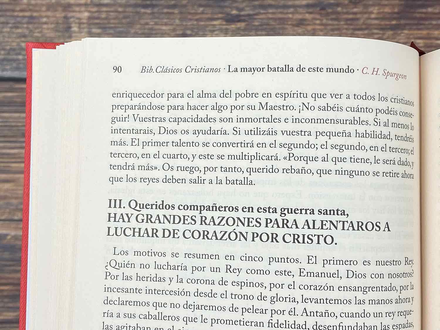 El resto del libro se compone de diez sermones de Spurgeon que describen la vida cristiana como una guerra. En estos mensajes, Spurgeon utilizaba metáforas militares, hablando de batallas, armas, soldados, heridas, municiones, defensa y ataque y, por supuesto, de nuestro Gran Capitán, Jesucristo. Algo interesante de estos sermones es cuán actuales siguen siendo hoy en día, más de 150 años después. La vida cristiana en este mundo caído será una guerra en cada generación, hasta que venga Jesús en el último día. Si quieres ser retado en tu letargo espiritual, estos sermones son un excelente recurso.