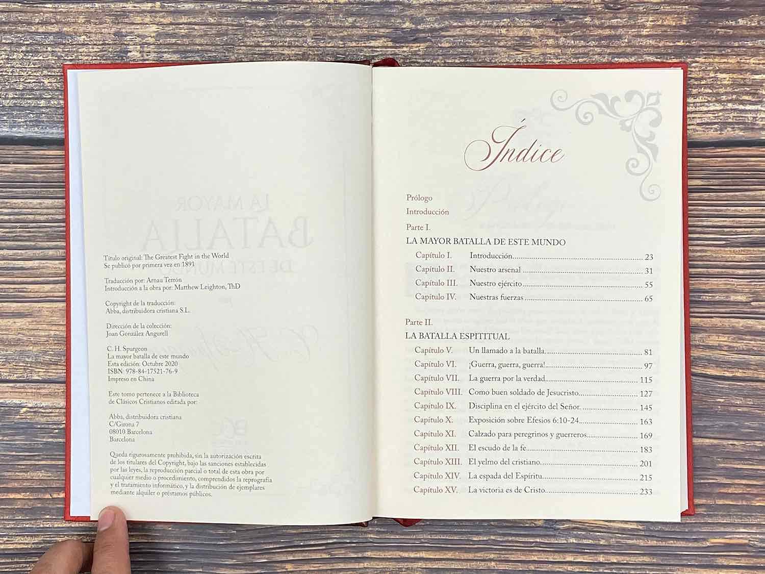 La primera parte de este libro contiene uno de los discursos más conocidos de Spurgeon: La mayor batalla de este mundo. Fue el último mensaje que impartió a sus colegas y estudiantes en el Colegio de Pastores, institución que fue fundada por él y de la cual era presidente. En este discurso, Spurgeon caracterizó la vida y el ministerio en especial como una batalla y brindó varios consejos sobre cómo pelearla bien con las armas (las Escrituras), el ejército (la iglesia) y la fuerza (el Espíritu Santo) que Dios da. La mayor batalla se publicó justo antes de su muerte y es de sus discursos más conocidos. Debe ser lectura obligada para pastores y todo creyente que quiera tomarse en serio su servicio en la iglesia local.