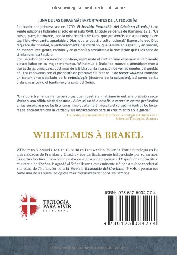 Con un sabor decididamente puritano, representa el cristianismo experiencial reformado y escolástico en su mejor momento. Wilhelmus à Brakel se mueve sistemáticamente a través de las principales doctrinas de la Biblia con la intención de ver las mentes del pueblo de Dios renovadas con el propósito de promover la piedad. Este tercer volumen contiene un tratamiento detallado de la soteriología (doctrina de la salvación), así como de las ordenanzas como el bautismo y la cena del Señor.