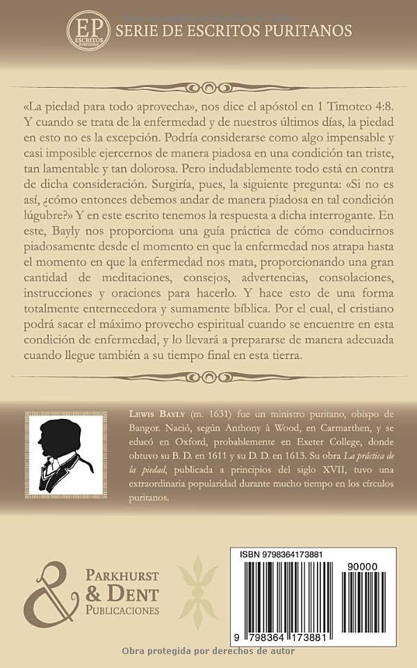 «La piedad para todo aprovecha», nos dice el apóstol en 1 Timoteo 4:8. Y cuando se trata de la enfermedad y de nuestros últimos días, la piedad en esto no es la excepción. Podría considerarse como algo impensable y casi imposible ejercernos de manera piadosa en una condición tan triste, tan lamentable y tan dolorosa. Pero indudablemente todo está en contra de dicha consideración. Surgiría, pues, la siguiente pregunta: «Si no es así, ¿cómo entonces debemos andar de manera piadosa en tal condición lúgubre?» Y en este escrito tenemos la respuesta a dicha interrogante. En este, Bayly nos proporciona una guía práctica de cómo conducirnos piadosamente desde el momento en que la enfermedad nos atrapa hasta el momento en que la enfermedad nos mata, proporcionando una gran cantidad de meditaciones, consejos, advertencias, consolaciones, instrucciones y oraciones para hacerlo. Y hace esto de una forma totalmente enternecedora y sumamente bíblica. Por el cual, el cristiano podrá sacar el máximo provecho espiritual cuando se encuentre en esta condición de enfermedad, y lo llevará a prepararse de manera adecuada cuando llegue también a su tiempo final en esta tierra.
