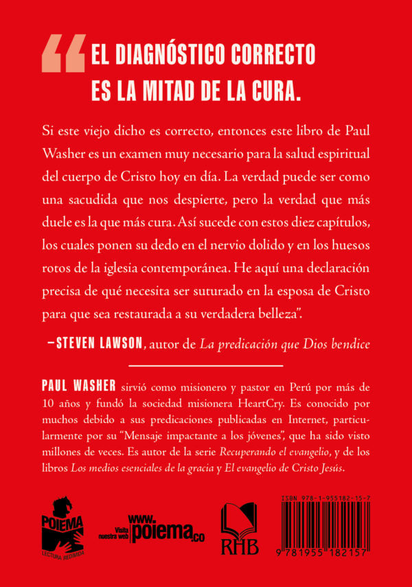 Si este viejo dicho es correcto, entonces este libro de Paul Washer es un examen muy necesario para la salud espiritual del cuerpo de Cristo hoy en día. La verdad puede ser como una sacudida que nos despierte, pero la verdad que más duele es la que más cura. Así sucede con estos diez capítulos, los cuales ponen su dedo en el nervio dolido y en los huesos rotos de la iglesia contemporánea. He aquí una declaración precisa de qué necesita ser suturado en la esposa de Cristo para que sea restaurada a su verdadera belleza”.