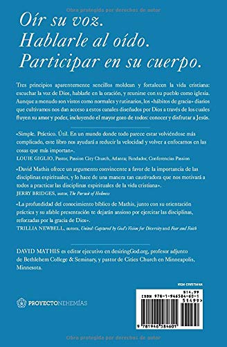 "Simple. Práctico. Útil. En un mundo donde todo parece estar volviéndose más complicado, este libro nos ayudar a reducir la velocidad y volver a enfocarnos en las cosas que más importan." -- LOUIE GIGLIO "Pastor, Passion City Church, Atlanta; Fundador, Conferencias Passion" "David Mathis ofrece un argumento convincente a favor de la importancia de las disciplinas espirituales, y lo hace de una manera tan cautivadora que nos motivar a todos a practicar las disciplinas espirituales de la vida cristiana." -- JERRY BRIDGES "autor, The Pursuit of Holiness"