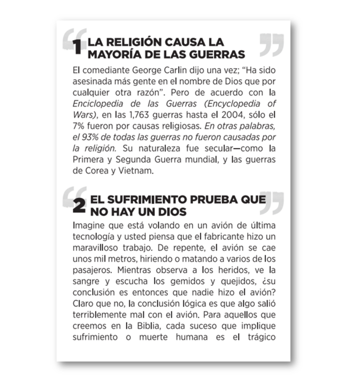 El comediante George Carlin dijo una vez: “Más personas han sido asesinadas en el nombre de Dios que por cualquier otra razón.” Pero según Encyclopedia of Wars, en las 1,763 guerras hasta 2004, solo el 7 por ciento eran religiosos. En otras palabras, el 93 por ciento de todas las guerras no fueron causadas por la religión. Eran de naturaleza secular, como la Primera y la Segunda Guerra Mundial, y las Guerras de Corea y Vietnam.