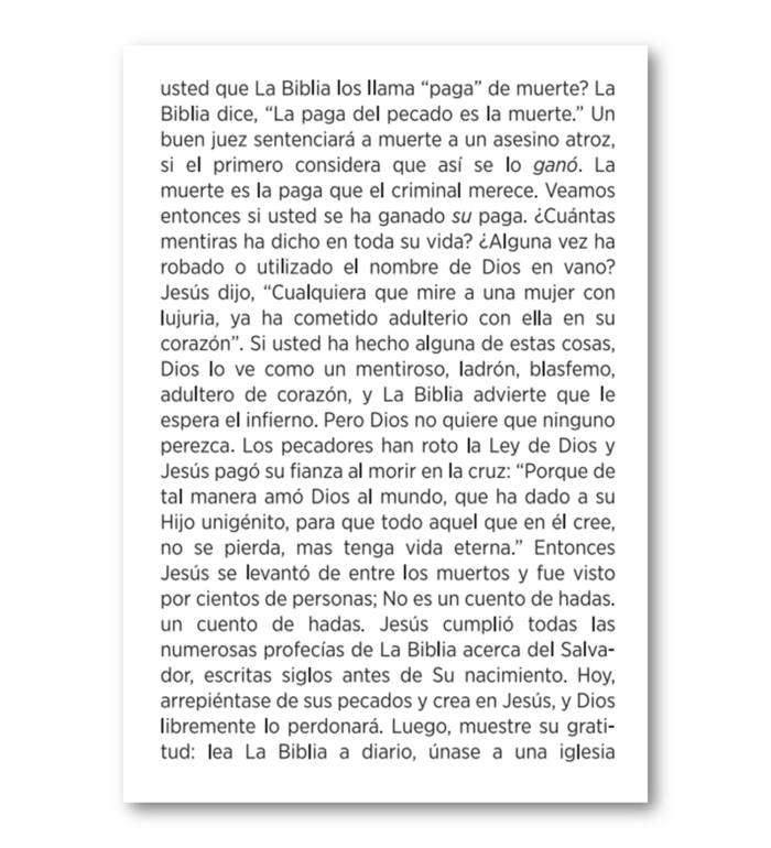 Esta es quizás la verdadera razón por la que no quieres confiar en Jesús. El problema tiene poco que ver con las preguntas anteriores, y todo tiene que ver con el hecho de que eres feliz siguiendo tu propio camino, lo que significa que puedes disfrutar de la pornografía, la fornicación y otros pecados placenteros. Sería más fácil hacer que un perro hambriento suelte un bistec tierno que que tú dejes tus amados pecados… a menos que puedas estar convencido de que estás en un peligro terrible. Déjame tratar de convencerte de ese peligro. ¿Sabías que la Biblia llama a la muerte “salario”? Dice: “La paga del pecado es muerte”. Un buen juez sentenciará a muerte a un atroz asesino si cree que eso es lo que se ganó. La muerte es el salario que el criminal merecía. Veamos si te has ganado tu salario. ¿Cuántas mentiras has dicho en tu vida? ¿Alguna vez has robado algo o has usado el nombre de Dios en vano? Jesús dijo: “Cualquiera que mira a una mujer para codiciarla, ya adulteró con ella en su corazón”. Si has hecho estas cosas, Dios te ve como un adúltero mentiroso, ladrón y blasfemo de corazón, y la Biblia advierte que el infierno te espera. Pero Dios no quiere que ninguno perezca. Los pecadores quebrantaron la Ley de Dios y Jesús pagó su multa muriendo en la cruz: “Tanto amó Dios al mundo que ha dado a su Hijo unigénito, para que todo el que cree en él no se pierda, sino que tenga vida eterna”. Entonces Jesús resucitó de entre los muertos y fue visto por cientos; no es un cuento de hadas. Jesús cumplió todas las numerosas profecías de la Biblia sobre la venida de un Salvador, escritas siglos antes de Su nacimiento. Hoy, arrepiéntete y confía en Jesús, y Dios te perdonará libremente. Luego muestre su gratitud: lea la Biblia todos los días, únase a una iglesia cristiana y bautícese. ¿Preguntas? NeedGod.com.