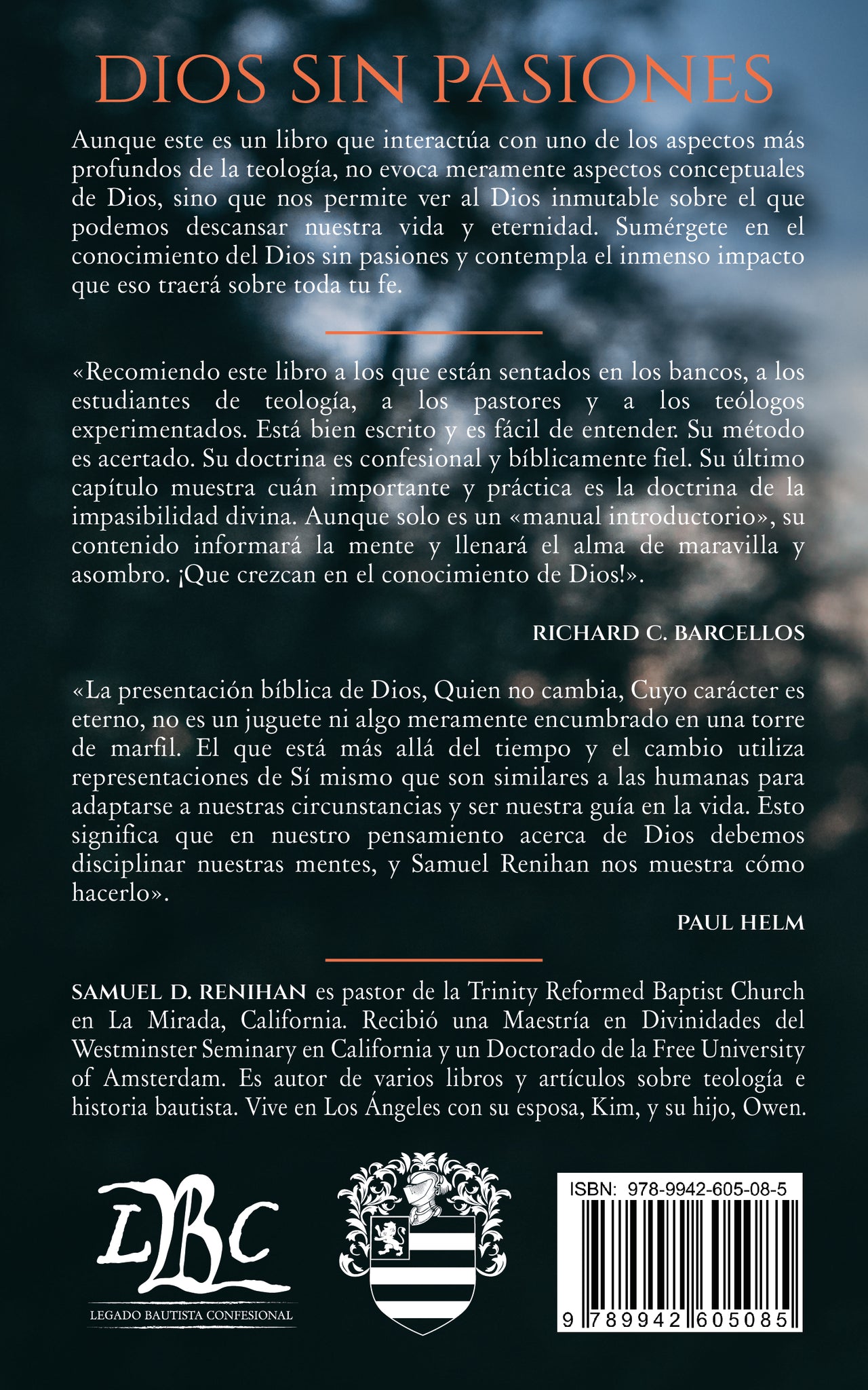 Este libro es un manual introductorio al profundo tema de la impasibilidad divina, que se refiere a que la naturaleza de Dios no sufre de pasiones. Este tema puede y ha llegado a ser malinterpretado debido a la complejidad en algunos puntos y también a un enfoque hermenéutico incompleto. El autor presenta a lo largo de cinco capítulos un viaje donde presenta el dilema o el problema con versículos que parecen dar la idea de Dios con emociones o sentimientos, pero también otros versículos donde Dios no cambia ni es afectado por la creación; y a partir de allí se desarrolla el tema definiendo el concepto de «pasión y emociones», luego sobre el cómo nosotros sabemos lo que sabemos de Dios (eminencia y negación) para pasar sobre el aspecto de las perfecciones y la encarnación de Dios. Finalmente el libro se enfoca en aplicaciones pastorales sobre la relación de la doctrina de la impasibilidad de Dios con respecto a nuestra vida cristiana y la esperanza y gozo que produce entender el tema correctamente.