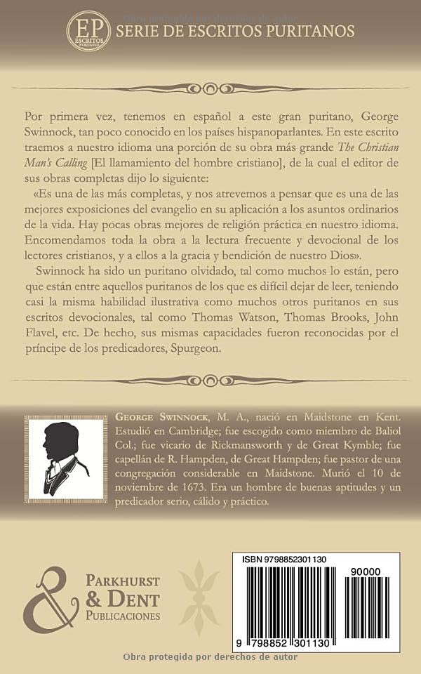 Por primera vez, tenemos en español a este gran puritano, George Swinnock, tan poco conocido en los países hispanoparlantes. En este escrito traemos a nuestro idioma una porción de su obra más grande The Christian Man’s Calling [El llamamiento del hombre cristiano], de la cual el editor de sus obras completas dijo lo siguiente: «Es una de las más completas, y nos atrevemos a pensar que es una de las mejores exposiciones del evangelio en su aplicación a los asuntos ordinarios de la vida. Hay pocas obras mejores de religión práctica en nuestro idioma. Encomendamos toda la obra a la lectura frecuente y devocional de los lectores cristianos, y a ellos a la gracia y bendición de nuestro Dios». Swinnock ha sido un puritano olvidado, tal como muchos lo están, pero que están entre aquellos puritanos de los que es difícil dejar de leer, teniendo casi la misma habilidad ilustrativa como muchos otros puritanos en sus escritos devocionales, tal como Thomas Watson, Thomas Brooks, John Flavel, etc. De hecho, sus mismas capacidades fueron reconocidas por el príncipe de los predicadores, Spurgeon, diciendo lo siguiente: «George Swinnock tenía el don de la ilustración ampliamente desarrollado, como lo prueban sus obras […]. Ellas sirvieron a su propósito e hicieron atractiva su enseñanza […]. Permanece una extraordinaria cantidad de ingenio y sabiduría santificados [en ellas]».