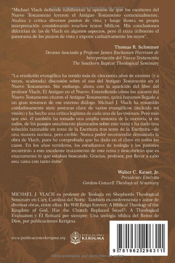 “La erudición evangélica ha tenido más de cincuenta años de extensa (y a veces, acalorada) discusión sobre el uso del Antiguo Testamento en el Nuevo Testamento. Sin embargo, ahora con la aparición del libro del profesor Vlach, El Antiguo en el Nuevo: Entendiendo cómo los autores del Nuevo Testamento citaron el Antiguo Testamento, quizá hayamos llegado a un gran resumen de ese extenso diálogo. Michael J. Vlach ha resumido cuidadosamente siete posturas clave de varios evangélicos (incluida mi visión) y ha hecho una crítica legítima de cada una de las visiones. Pero más que eso, él también ha tomado una amplia muestra de la mayoría, si no todos, de los pasajes usualmente planteados sobre este tema y ha dado una solución razonable en texto de la Escritura tras texto de la Escritura—de una manera sucinta, pero creíble. Nunca podré recomendar demasiado la obra de Vlach, pues he comprobado que ha dado en el clavo en todos los casos. En los años venideros, los estudiantes de teología y los pastores recurrirán a este excelente tratamiento de este tema y descubrirán que es exactamente lo que estaban buscando. Gracias, profesor, por llevar a cabo esta tarea con tanto éxito”.
