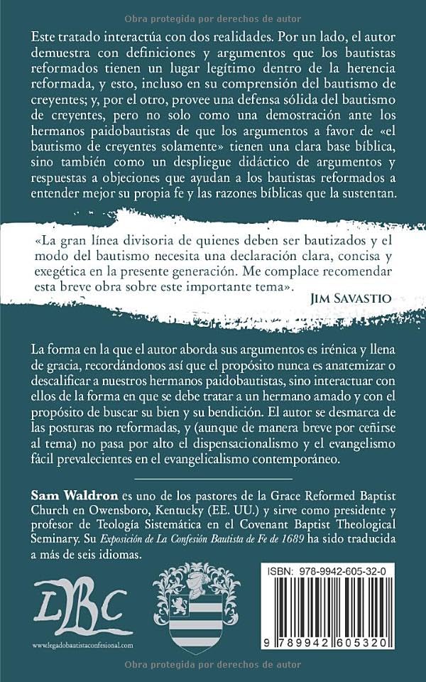 «Cuando los paidobautistas escuchan el término “bautista reformado”, muchos de ellos piensan: ¡No se puede ser reformado y bautista a la vez! Pero este breve libro de mi mentor, colega y querido amigo demuestra lo contrario. Sin dejar de ser irénico hacia los puntos de vista opuestos de los paidobautistas, este volumen ofrece una vigorosa defensa de la postura bautista, ¡y lo hace nada menos que desde una perspectiva reformada de las Escrituras! Recomiendo encarecidamente este libro al público lector como un llamado para que todos seamos más reformados conforme a las Escrituras».