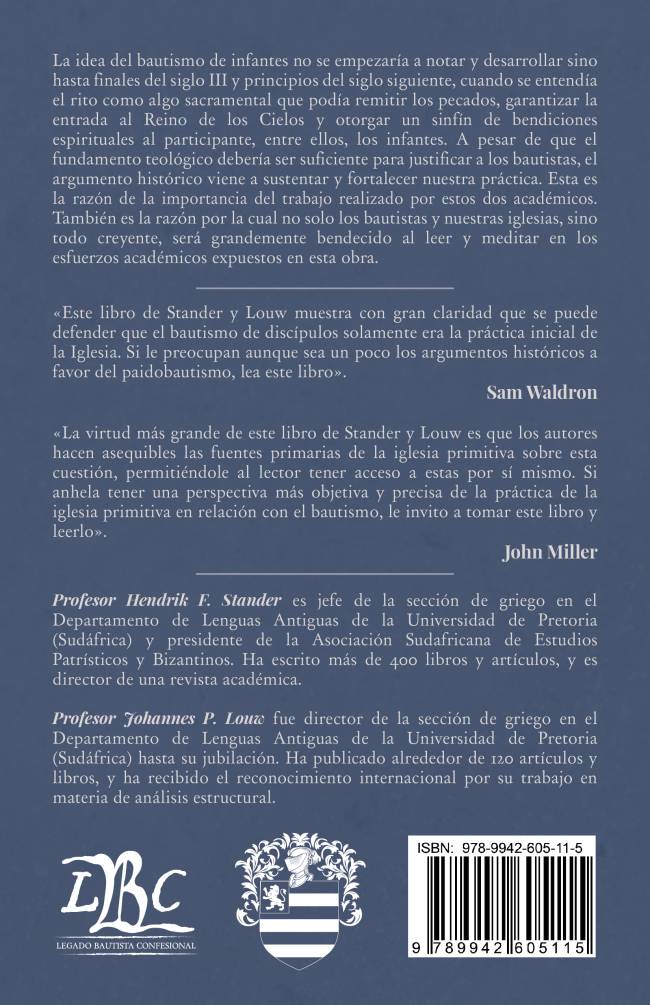 Este libro presenta un análisis histórico de fuentes primarias sobre la información existente de la práctica del bautismo en los primeros cuatro siglos de la historia de la iglesia cristiana. Comienza con los padres apostólicos (incluyendo la didaché), pasando por Justino, Ireneo, Clemente de Alejandría, Tertuliano, incluyendo menos conocidos como Novaciano, Hipólito, Ambrosio, Crisóstomo, hasta una evaluación de las inscripciones en las tumbas cristianas y el arte paleocristiano donde hacen referencias al rito del bautismo. Los autores exponen el contexto con las citas específicas donde arrojan luz importante sobre el tema y hacen una crítica del mal uso descontextualizado de fragmentos literarios, a la vez que proveen un mejor entendimiento de la información disponible sobre el bautismo hasta el siglo cuarto. Este estudio muestra una correlación presente de la práctica del bautismo con la fe profesada expresados en bautismos de creyentes y la inclusión paulatina del bautismo de infantes por diferentes razones.
