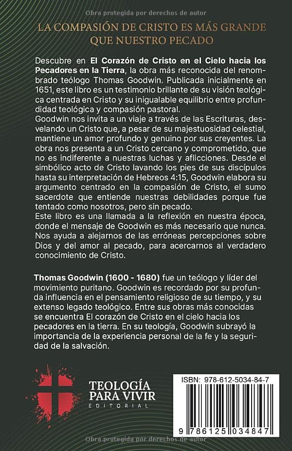"El Corazón de Cristo en el Cielo hacia los Pecadores en la Tierra" fue publicado inicialmente en 1651. Pronto, se transformó en la obra más destacada de Thomas Goodwin (1600-1680). Este libro es una excelente muestra de su perspectiva centrada en Cristo, así como de su combinación de precisión teológica y sensibilidad pastoral. En esta obra, Goodwin busca demostrar a través de las Escrituras que, incluso en toda su majestuosidad celestial, Cristo no se encuentra distante ni despreocupado por los creyentes, sino que mantiene un profundo afecto por ellos.