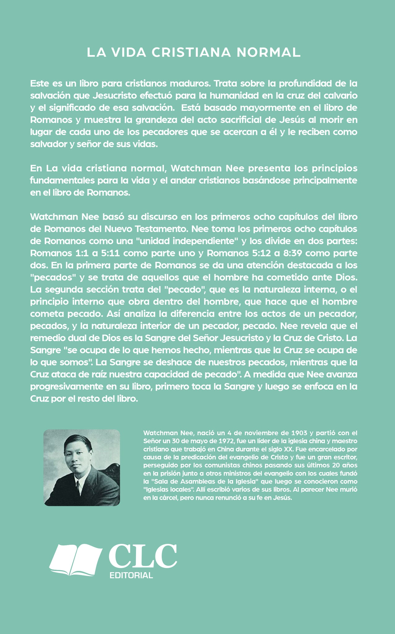 La vida cristiana normal es el gran clásico cristiano de Watchman Nee que desarrolla el tema central de “Cristo nuestra vida”. A partir de pasajes clave de Romanos, Nee revela el secreto de la vitalidad espiritual que debe ser la experiencia normal de todo cristiano. Su énfasis en la cruz y la resurrección de Jesucristo contiene ideas frescas que han demostrado ser una bendición para muchos.